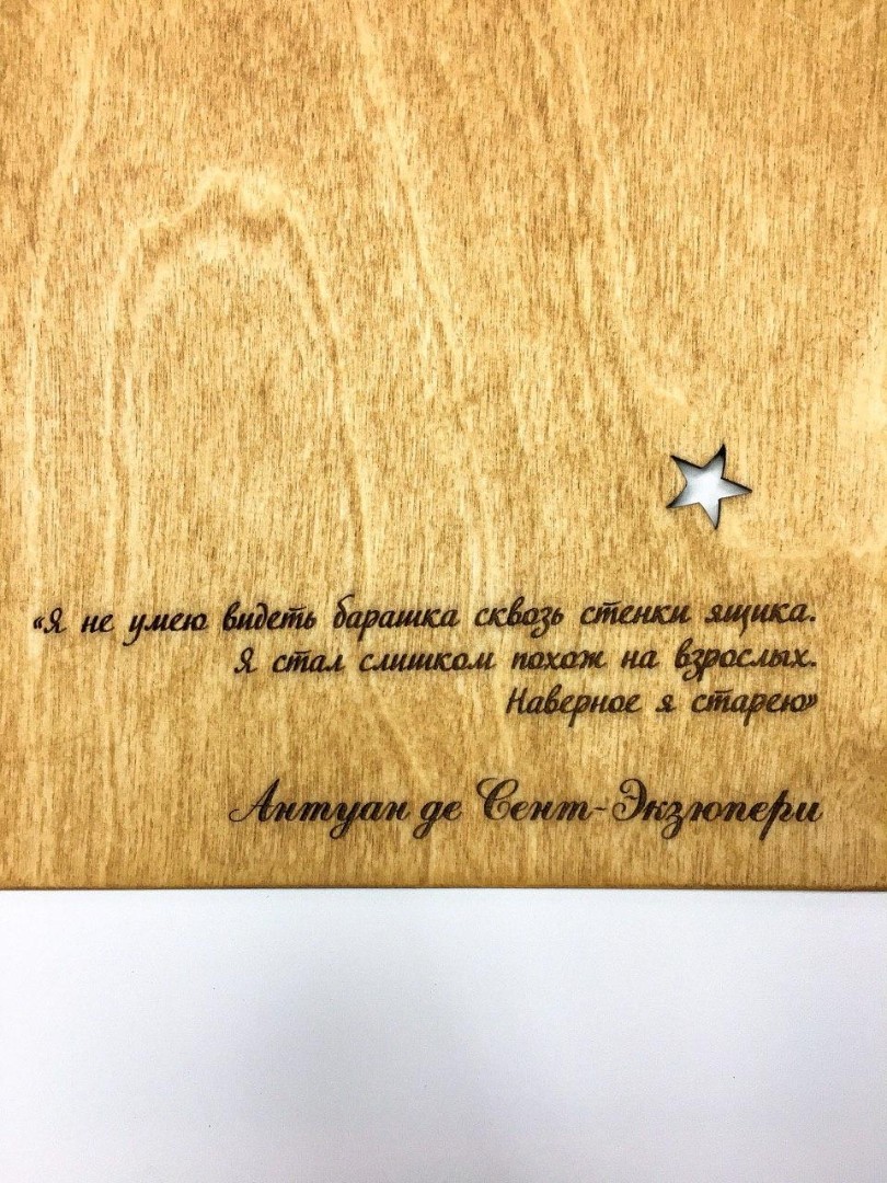 Деревянный блокнот с рисунком по мотивам книги Антуана де Сент-Экзюпери – маленький принц. Гравировка по двум сторонам обложки. В наличии и под заказ в Бресте.
