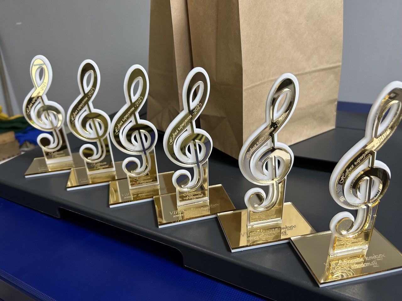 – Материал и дизайн: Статуэтка выполнена из сочетания золотого и молочного оргстекла толщиной 3 мм, что придает ей элегантный и современный вид. Изящный дизайн в виде скрипичного ключа подчеркивает музыкальную тематику награды.
