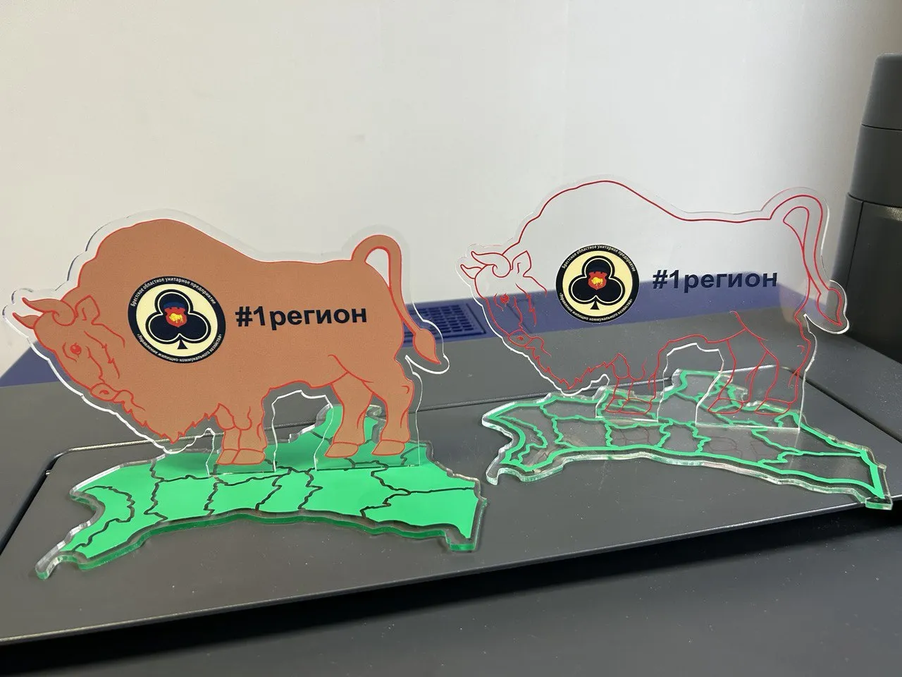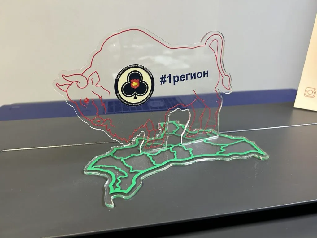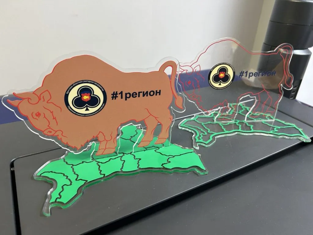 Фигурные призы из оргстекла – например, в виде карты региона с символикой и яркими акцентами. Такие награды становятся не только памятным сувениром, но и эффектным украшением для офиса или клуба.