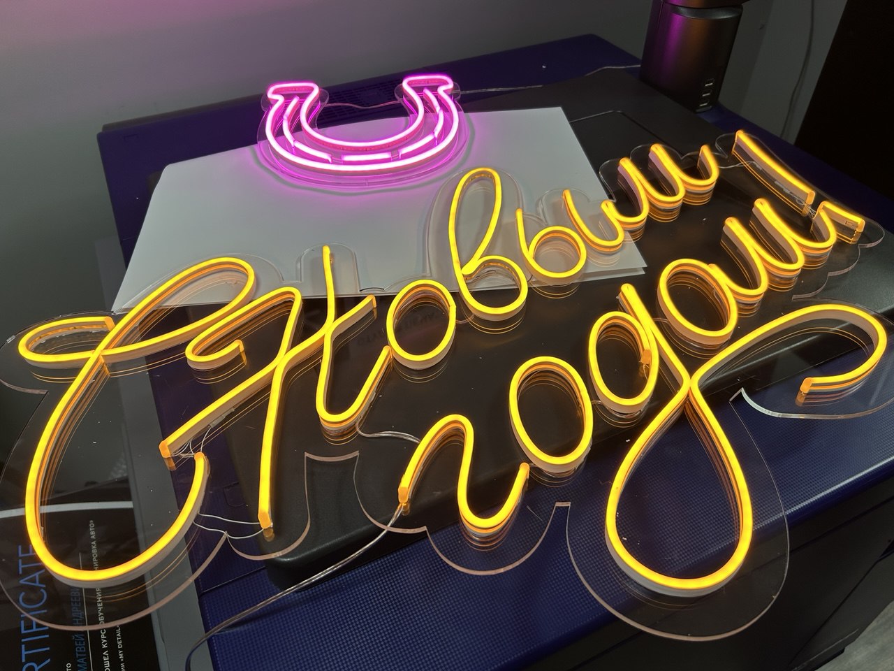 Гибкость дизайна: Мы можем воплотить любой шрифт, логотип или даже сложный контур (как та самая подкова или изящная надпись «С Новым годом!» на фото).